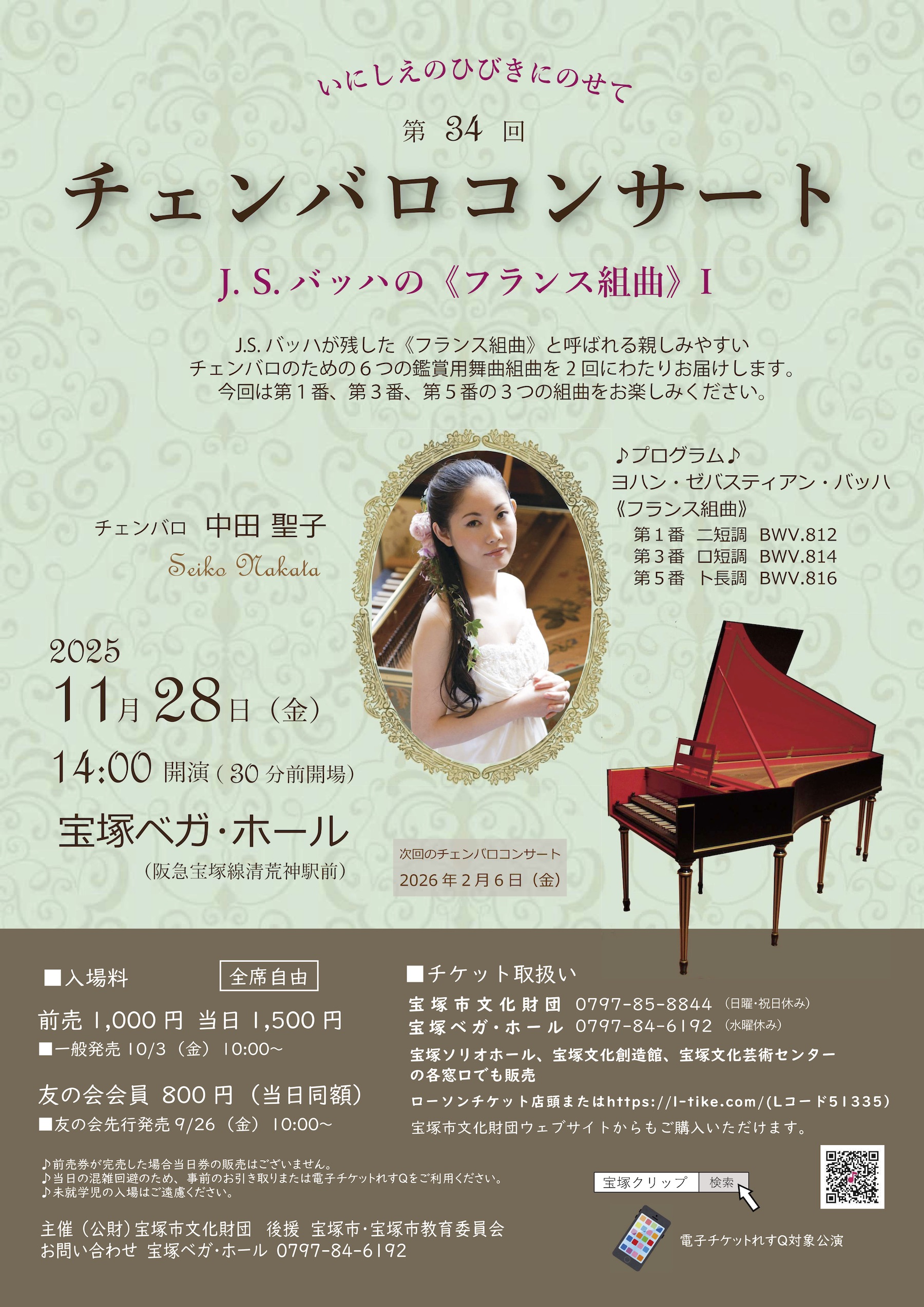 宝塚ベガ・ホールのチェンバロ・コンサートがございます。25年度は、J.S.バッハの《フランス組曲》全6曲を2回に分けてお届けします。11月は第1、第3、第5番を演奏します。皆様のご来場をお待ちしております。